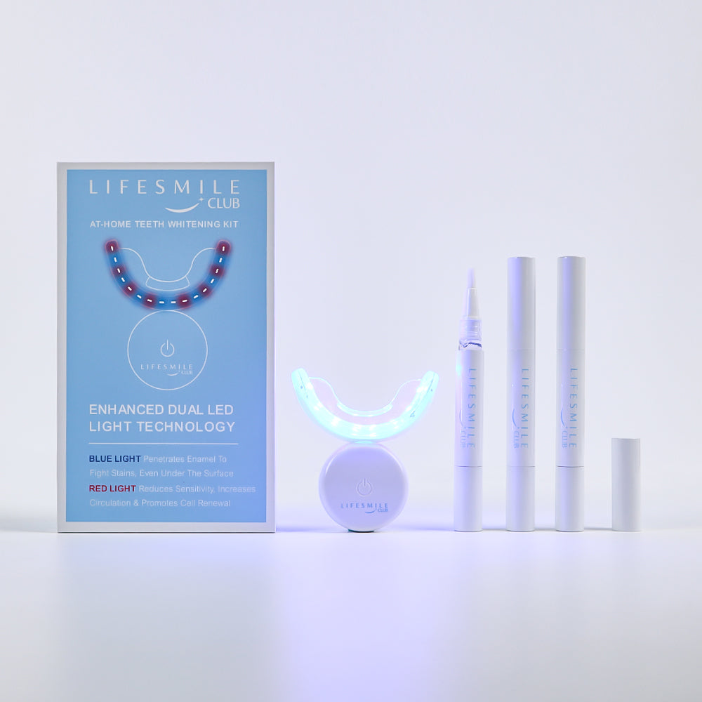 Our LIFESMILE at-home teeth whitening kit includes professional whitening gel and an Enhanced Dual Blue/Red LED Light Technology that accelerates the whitening process giving you a brighter, more confident smile in just 1 week!